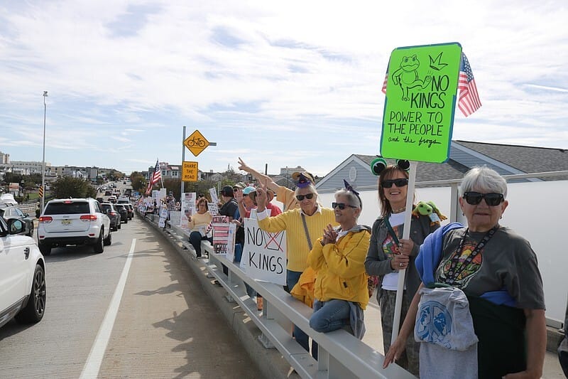 Donald Trump was the target of a litany of insults from more than 1,000 demonstrators who lined the main entryway into Ocean City on Saturday during a noisy, but peaceful, No Kings protest against the president and his policies. For more on the story, visit https://ocnjdaily.com/news/2025/oct/18/no-kings-rally-draws-more-than-1000-protesters-in-ocean-city/.